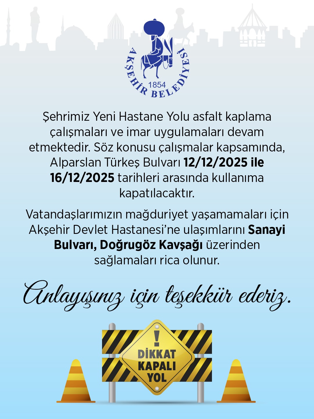Akşehir Belediyesi tarafından yapılan açıklamada,"Şehrimiz Yeni Hastane Yolu asfalt kaplama çalışmaları ve imar uygulamaları devam etmektedir. Söz konusu çalışmalar kapsamında, Alparslan Türkeş Bulvarı 12.12.2025 ile 16.12.2025 tarihleri arasında kullanıma kapatılacaktır. Vatandaşlarımızın mağduriyet yaşamamaları için Akşehir Devlet Hastanesi'ne ulaşımlarını Sanayi Bulvarı, Doğrugöz Kavşağı üzerinden sağlamaları rica olunur. Anlayışınız için teşekkür ederiz." ifadelerine yer verildi.