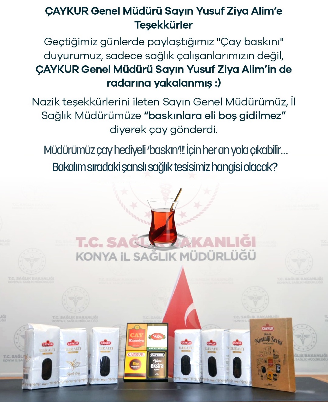 Konya İl Sağlık Müdürlüğü'nün bu renkli paylaşımı, ÇAYKUR Genel Müdürü Sayın Yusuf Ziya Alim'in de dikkatinden kaçmadı. Sayın Alim, Müdürlük'e teşekkürlerini ileterek "baskınlara eli boş gidilmez” diyerek çay gönderdi.