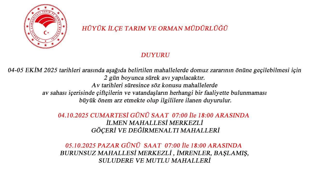 Avın ikinci günü olan 5 Ekim 2025 Pazar günü ise yine aynı saatler arasında Burunsuz merkezli, İmrenler, Başlamış, Suludere ve Mutlu mahallelerini kapsayan bölgede av düzenlenecek.