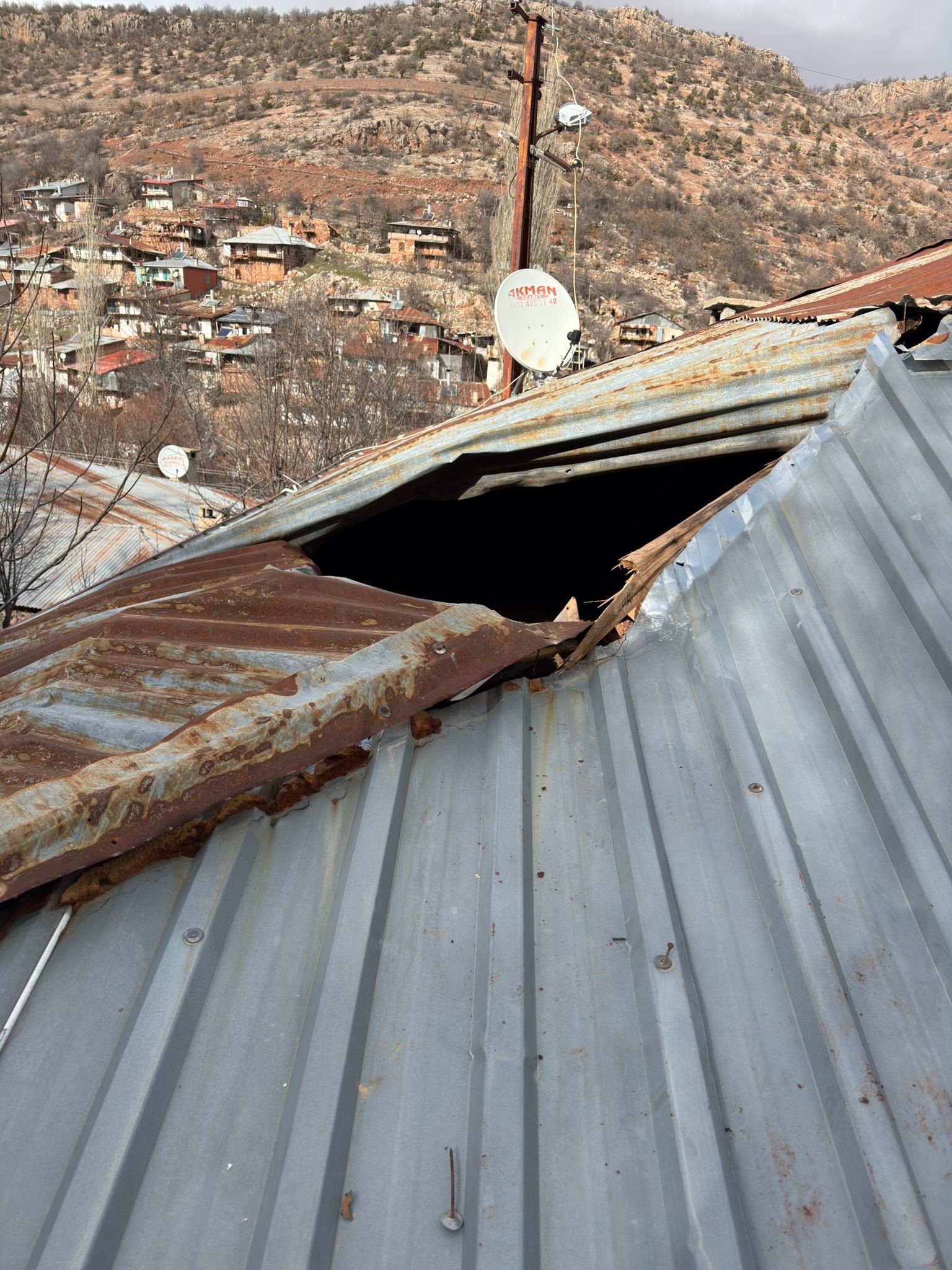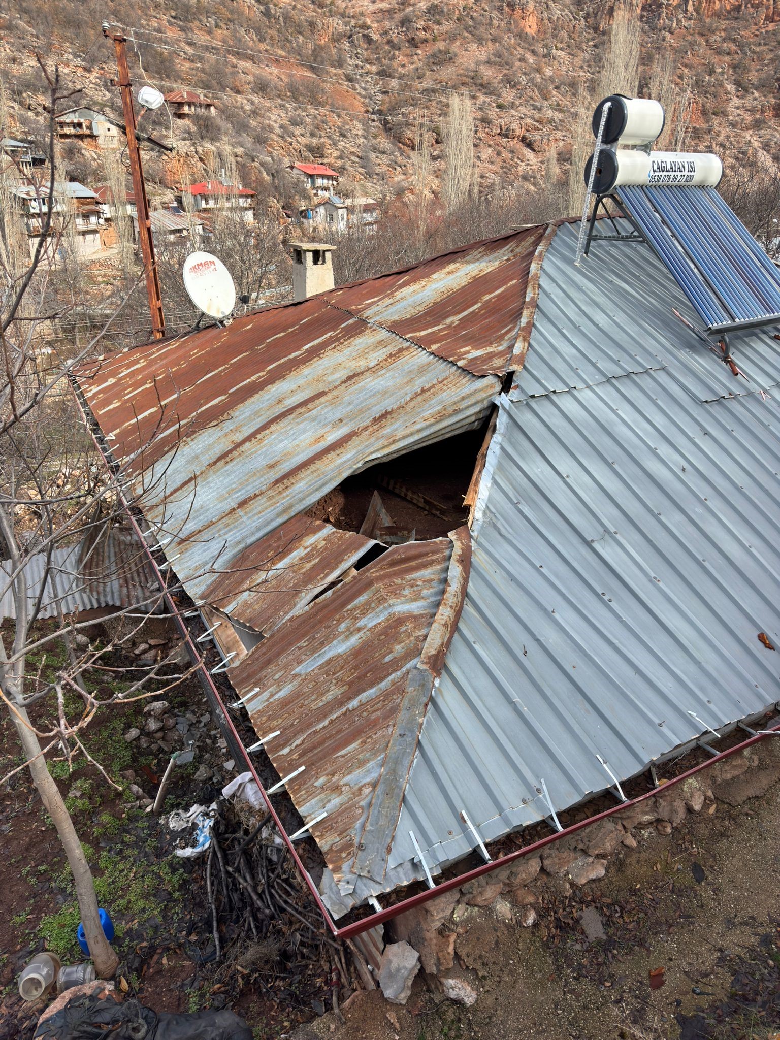 Dağdan kopan kaya, önce evin çinko çatısını yırtarak damın toprak zeminie saplandı. Olay anında evde kimse bulunmadığı öğrenilirken, evde maddi hasar oluştu.