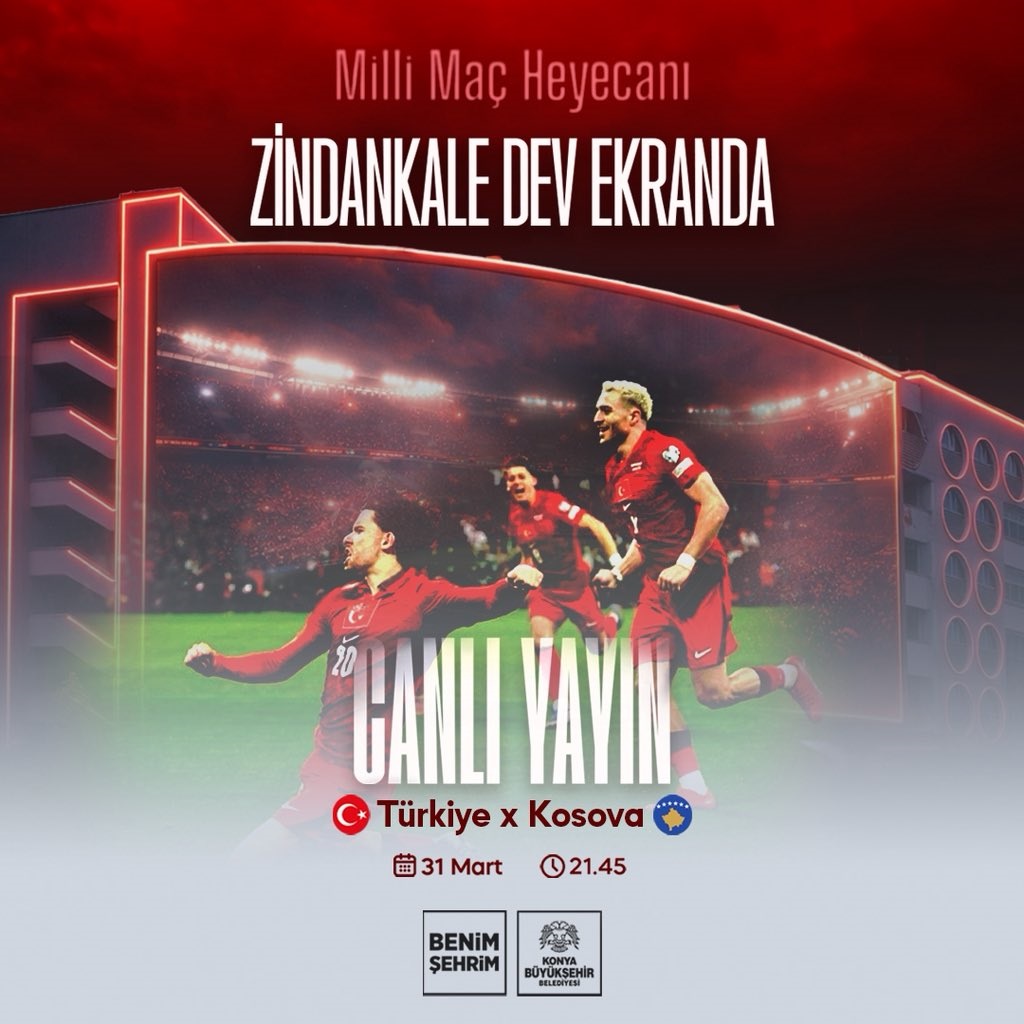 Konya Büyükşehir Belediyesi, A Milli Futbol Takımı'nın bugün Kosova ile oynayacağı kritik karşılaşma için vatandaşları Zindankale'de kurulacak dev ekranda buluşmaya davet etti.