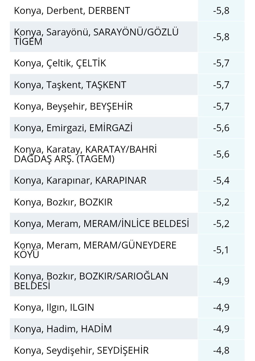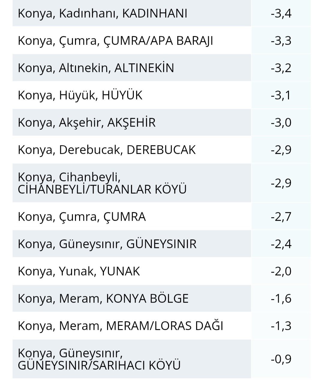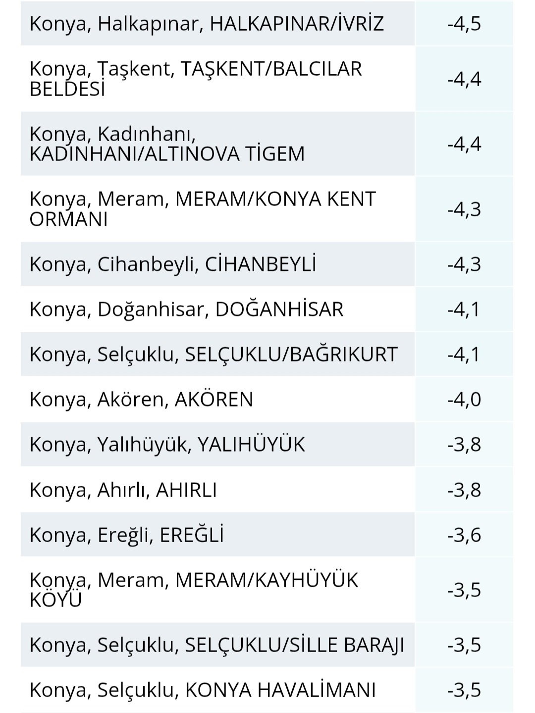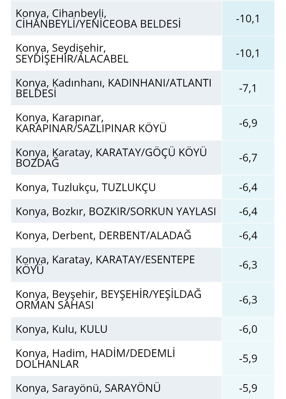 Merkez ilçeler dahil olmak üzere Konya'nın tamamında don etkili oldu. Cihanbeyli, Seydişehir, Karatay, Beyşehir, Derbent ve Karapınar başta olmak üzere birçok noktada sıcaklıklar -5 ila -7 derece arasında ölçüldü. Yüksek kesimlerde ise değerler daha da aşağı indi. Tarım alanlarında don riski dikkat çekerken, üreticilerin tedbirli olması gerektiği belirtildi.