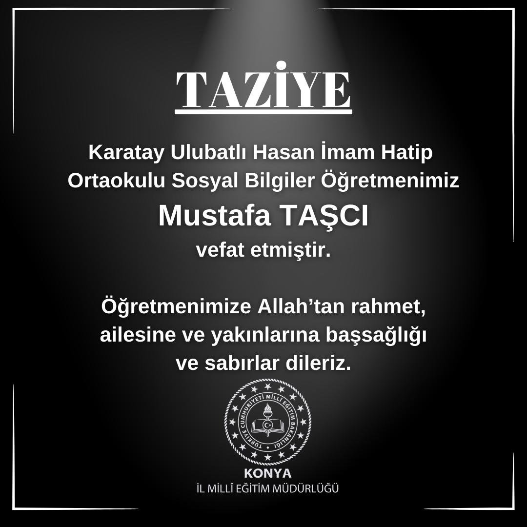 Konya İl Millî Eğitim Müdürlüğü tarafından yapılan açıklamada, "Karatay Ulubatlı Hasan İmam Hatip Ortaokulu Sosyal Bilgiler Öğretmenimiz Mustafa TAŞCI vefat etmiştir. Öğretmenimize Allah'tan rahmet, ailesine ve yakınlarına başsağlığı ve sabırlar dileriz." ifadelerine yer verildi.