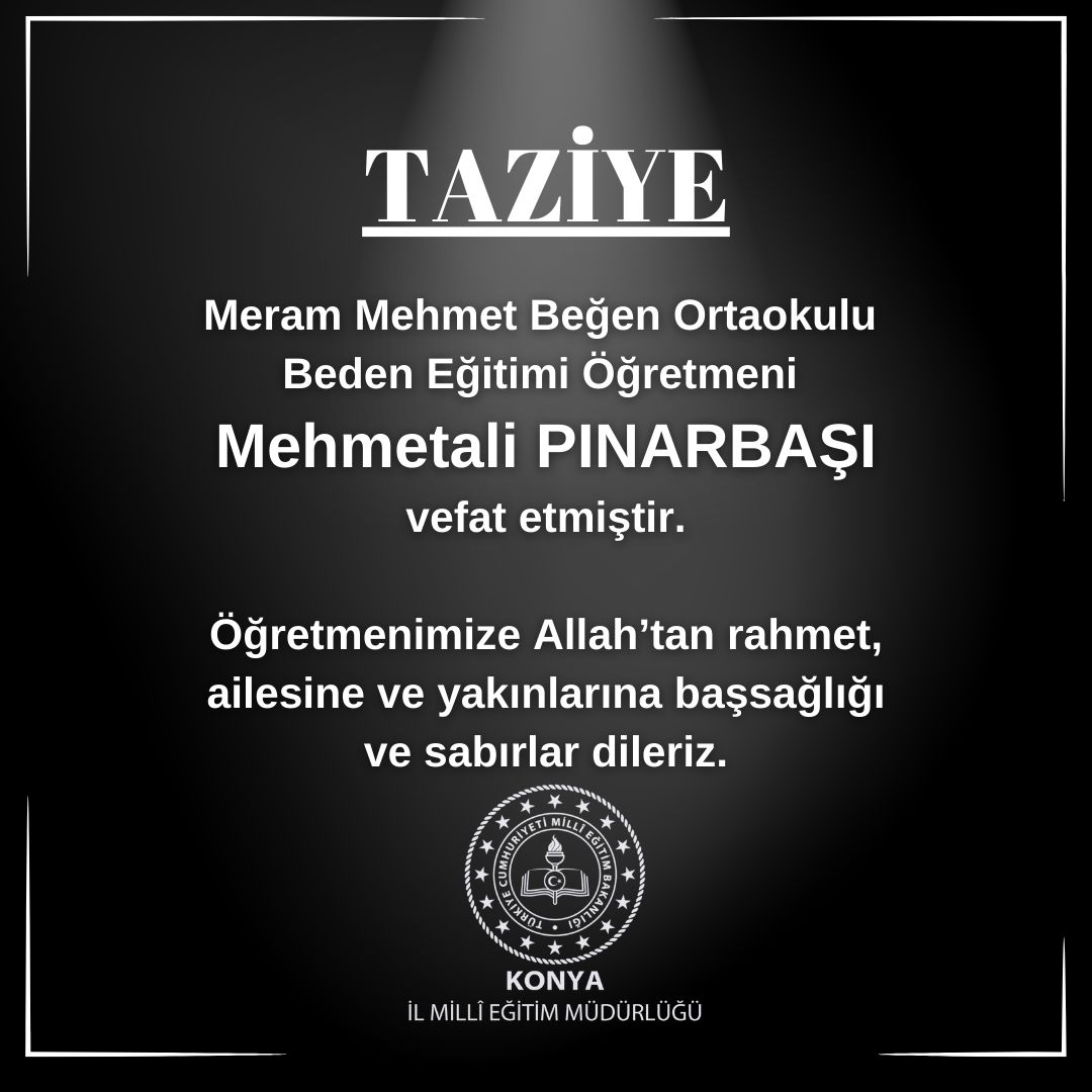 "Meram Mehmet Beğen Ortaokulu Beden Eğitimi Öğretmeni Mehmetali PINARBAŞI vefat etmiştir. Öğretmenimize Allah'tan rahmet, ailesine ve yakınlarına başsağlığı ve sabırlar dileriz."