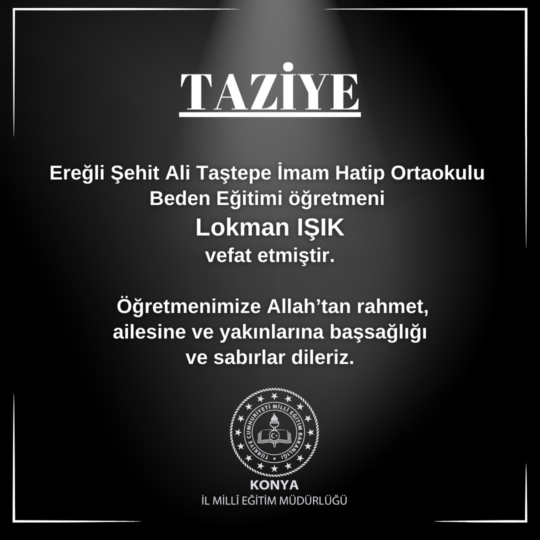 Konya İl Millî Eğitim Müdürlüğü, yayımladığı taziye mesajında öğretmen Lokman Işık'ın vefatını derin bir üzüntüyle karşıladıklarını belirtti.