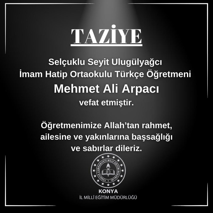 Konya İl Millî Eğitim Müdürlüğü tarafından yayımlanan taziye mesajında, "Selçuklu Seyit Ulugülyağcı İmam Hatip Ortaokulu Türkçe Öğretmeni Mehmet Ali Arpacı vefat etmiştir.