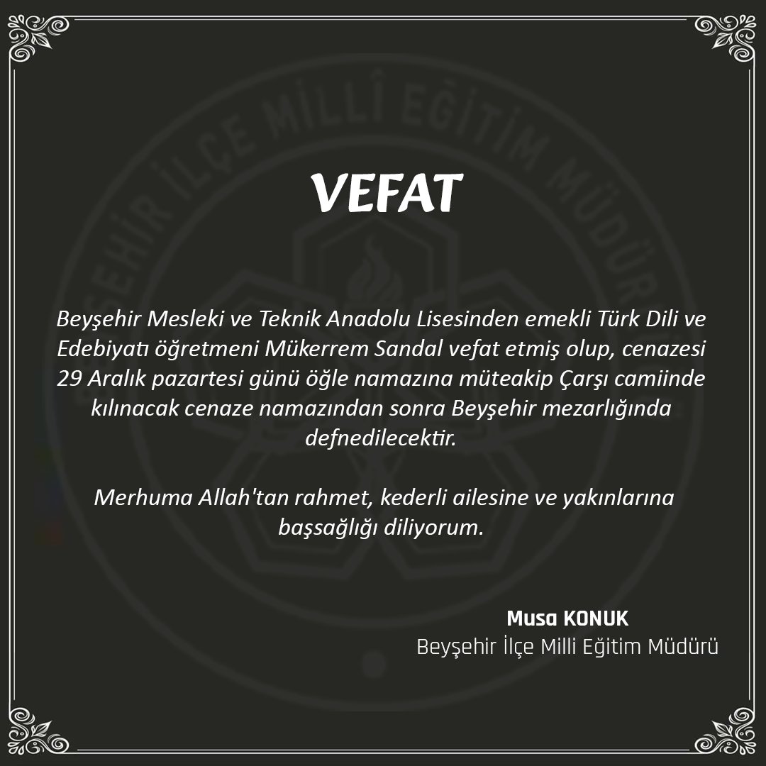 "Beyşehir Mesleki ve Teknik Anadolu Lisesinden emekli Türk Dili ve Edebiyatı öğretmeni Mükerrem Sandal vefat etmiş olup, cenazesi 29 Aralık pazartesi günü öğle namazına müteakip Çarşı camiinde kılınacak cenaze namazından sonra Beyşehir mezarlığında defnedilecektir. Merhuma Allah'tan rahmet, kederli ailesine ve yakınlarına başsağlığı diliyorum."