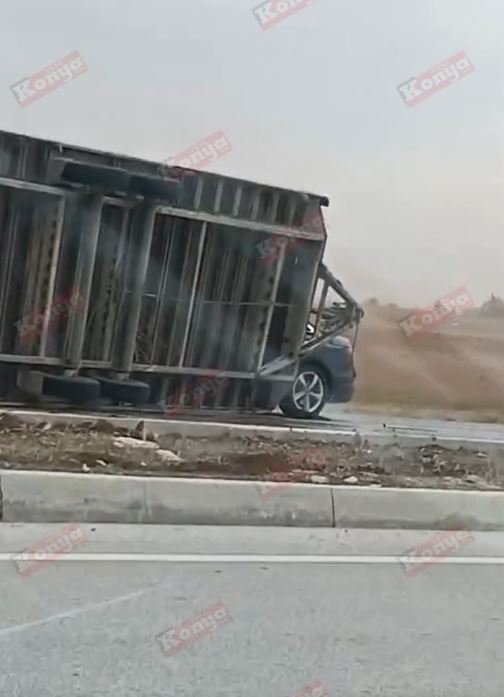 Konya'da etkisini sürdüren şiddetli rüzgâr, Konya–Karaman karayolunda tehlikeli anların yaşanmasına neden oldu. O anlar seyir halinde olan bir sürücünün cep telefonu kamerasına yansıdı.