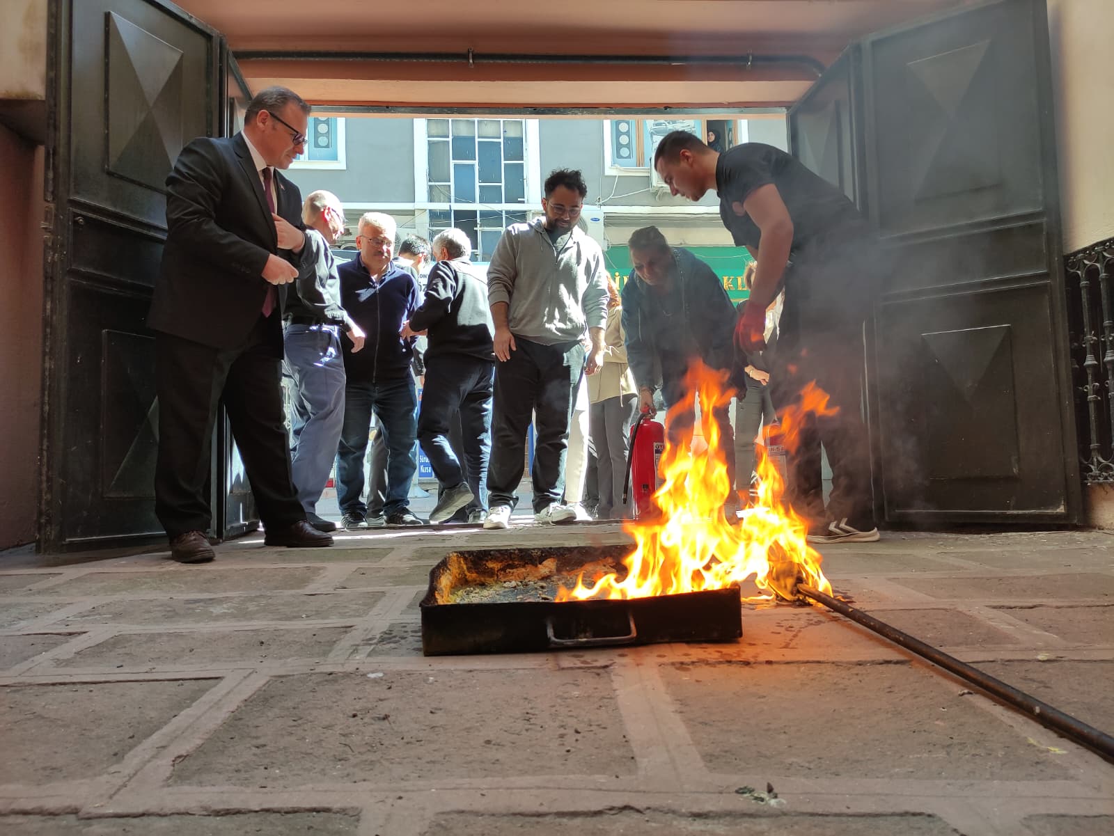 Eğitimin ardından, personelin de katılımıyla kurum otoparkında yangın söndürme tatbikatı gerçekleştirildi. Tatbikatta otoparktaki boş alanda, mazot dökülerek yakılan geniş kaba yangın söndürme tüpüyle müdahale yöntemleri uygulamalı olarak gösterildi.