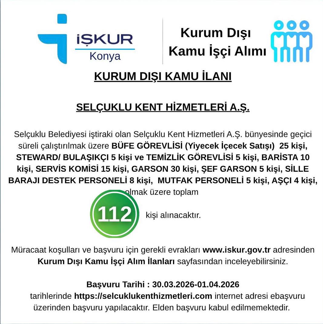 Konya'da iş arayanlara önemli bir fırsat sunuldu. Selçuklu Belediyesi iştiraki Selçuklu Kent Hizmetleri A.Ş., farklı kadrolarda görevlendirilmek üzere toplam 112 geçici işçi alımı yapacağını duyurdu. Alımlar, İŞKUR üzerinden yayımlanan "Kurum Dışı Kamu İşçi Alımı” ilanı kapsamında gerçekleştirilecek.