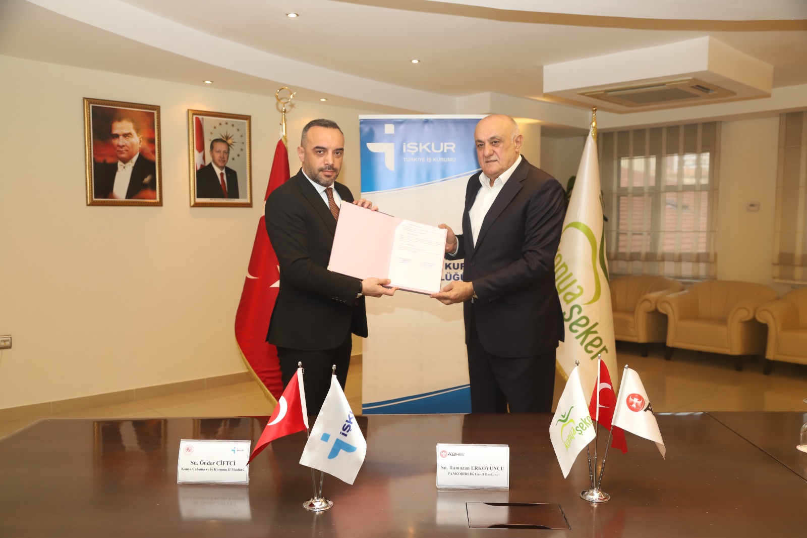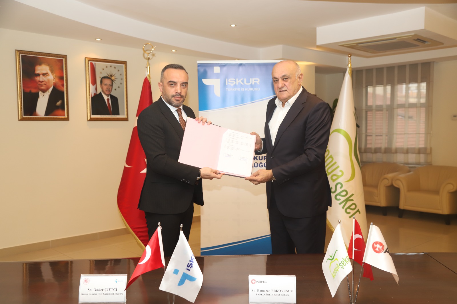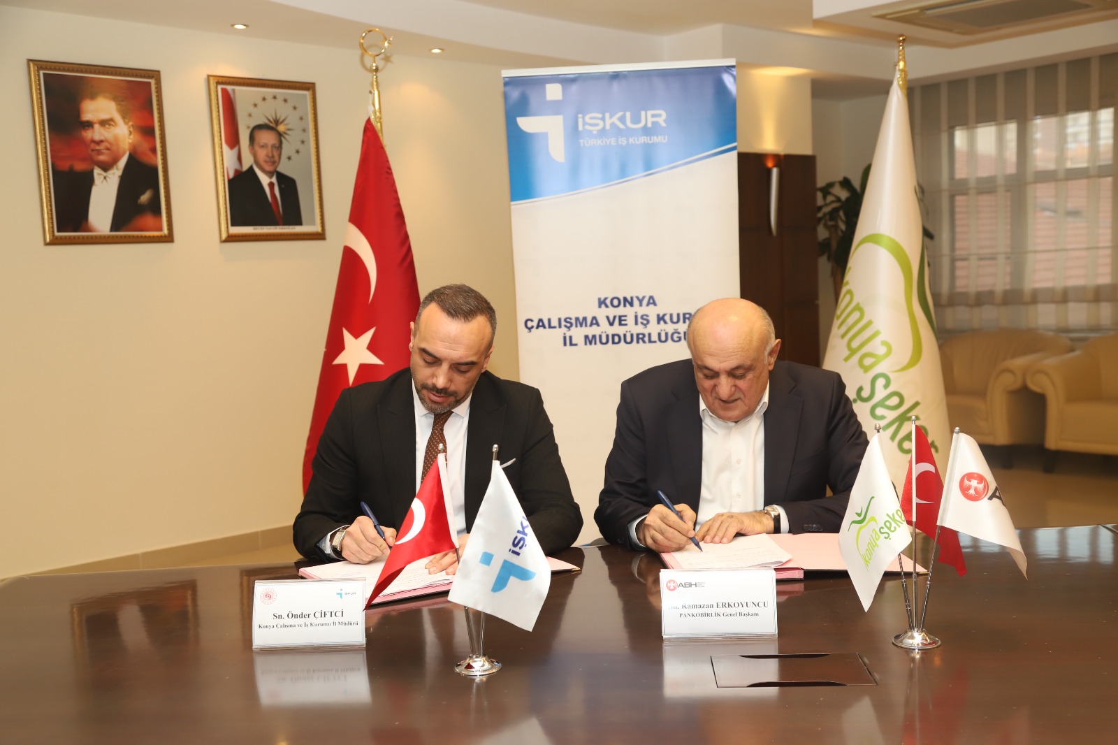 PANKOBİRLİK Genel Başkanı ve Konya Pancar Ekicileri Kooperatifi Yönetim Kurulu Başkanı Ramazan Erkoyuncu, kamu ve özel sektör iş birliklerinin istihdamın artırılması, işgücü piyasasının güçlendirilmesi ve sürdürülebilir kalkınma açısından büyük önem taşıdığını ifade etti. Başkan Erkoyuncu açıklamasının devamında; "Konya Çalışma ve İş Kurumu İl Müdürlüğü ile Anadolu Birlik Holding arasında; il genelinde istihdamın artırılması, işgücü piyasasının güçlendirilmesi ve işsizliğin azaltılmasına katkı sağlanması amacıyla "Aktif İşgücü Programları ve İstihdamın Geliştirilmesine Yönelik İş Birliği Protokolü” imzalanmıştır. Kamu ve özel sektör iş birliğiyle hayata geçirilen bu protokolün, özellikle mesleki eğitim ve istihdam alanlarında somut ve sürdürülebilir sonuçlar üretmesi hedeflenmektedir. İŞKUR ile yaptığımız bu iş birliği son derece kıymetlidir. Anadolu Birlik Holding olarak, Konya'da istihdama en büyük katkıyı sunan bir kurum olmanın sorumluluğuyla hareket ediyoruz. Bu protokol, Konyalı hemşehrilerimizin işe daha kolay erişebilmesi açısından büyük önem taşırken, aynı zamanda kurumlarımızın nitelikli iş gücüne ulaşmasını da kolaylaştıracaktır. İstihdam odaklı bu tür iş birliklerini son derece önemsiyor; kamu–özel sektör dayanışmasının güçlenerek devam etmesini temenni ediyoruz” ifadelerini kullandı.
