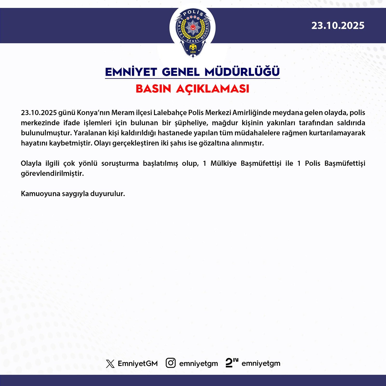 Emniyet Genel Müdürüğü tarafından yapılan açıklamada, "23.10.2025 günü Konya'nın Meram ilçesi Lalebahçe Polis Merkezi Amirliğinde meydana gelen olayda, polis merkezinde ifade işlemleri için bulunan bir şüpheliye, mağdur kişinin yakınları tarafından saldırıda bulunulmuştur. Yaralanan kişi kaldırıldığı hastanede yapılan tüm müdahalelere rağmen kurtarılamayarak hayatını kaybetmiştir. Olayı gerçekleştiren iki şahıs ise gözaltına alınmıştır. Olayla ilgili çok yönlü soruşturma başlatılmış olup, 1 Mülkiye Başmüfettişi ile 1 Polis Başmüfettişi görevlendirilmiştir. Kamuoyuna saygıyla duyurulur" denildi.