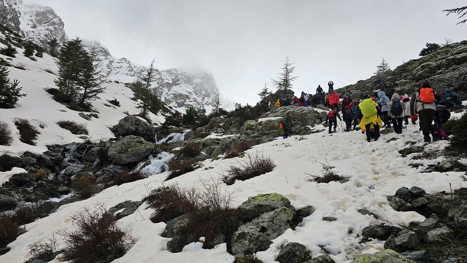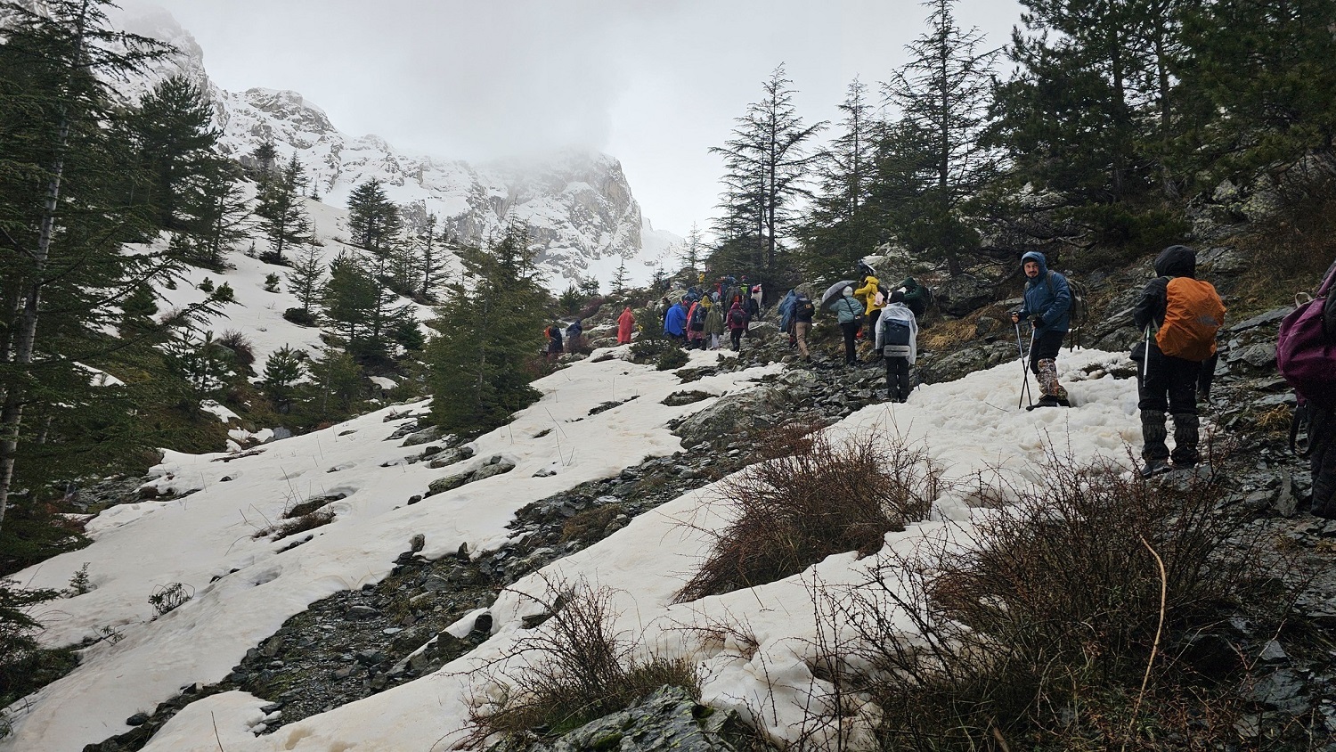 Katılımcılar, beyaz örtüyle kaplı orman ağaçlarının arasında, eriyen karların ve yağmurun oluşturduğu pınarlar arasında yürüdü.