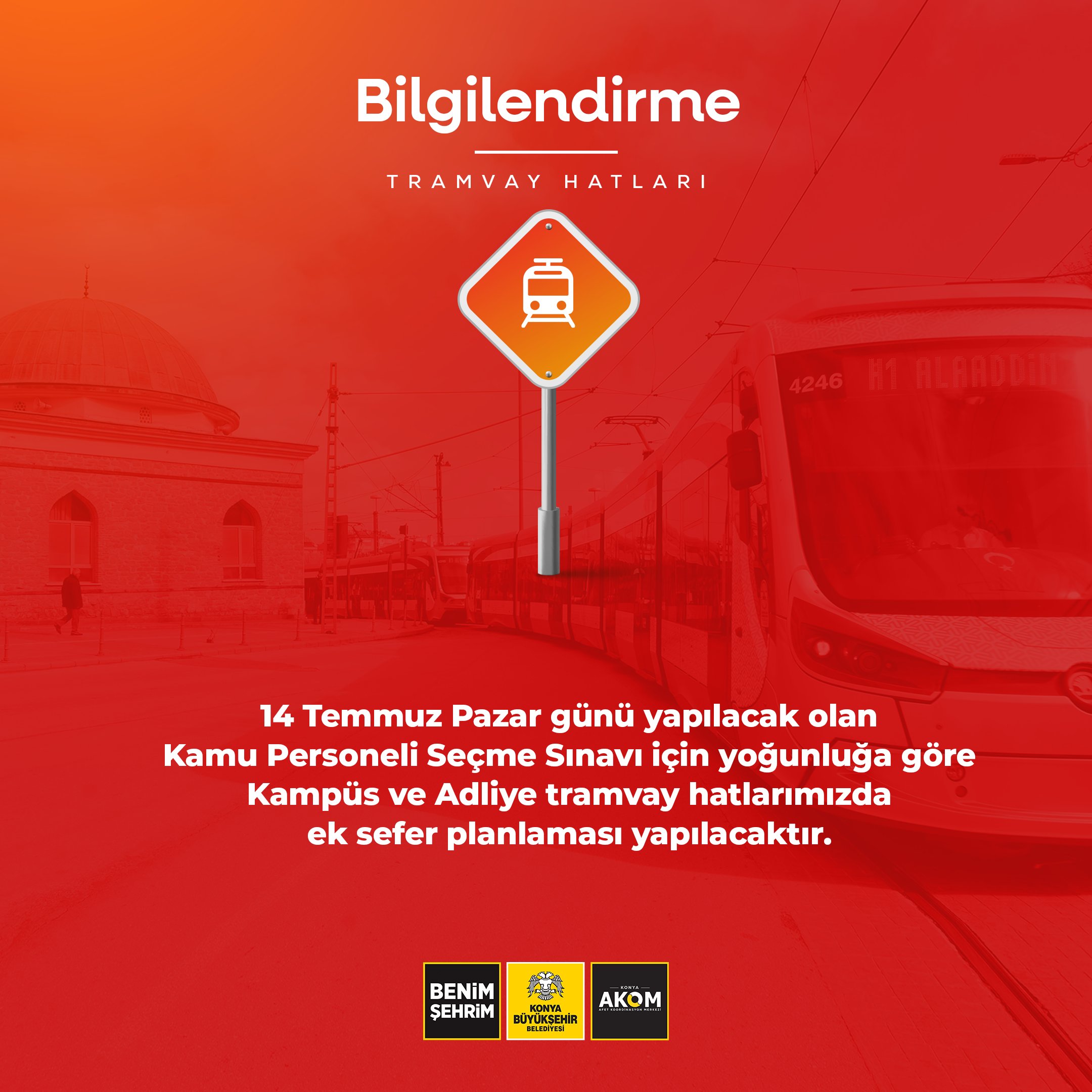 Konya AKOM 14 Temmuz Pazar günü yapılacak olan Kamu Personeli Seçme Sınavı (KPSS) için Kampüs ve adliye tramvay hatlarında ek sefer planlaması yapılacağını duyurdu.