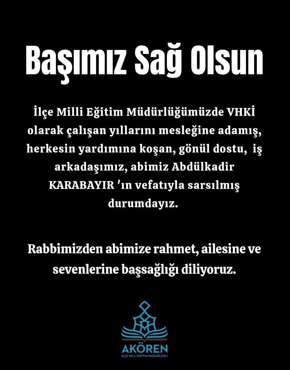Konya'nın Akören ilçesinde görev yapan Milli Eğitim Müdürlüğü personeli Abdulkadir Karabayır hayatını kaybetti.