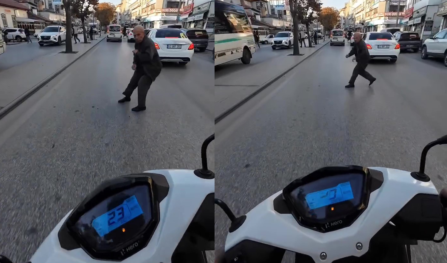 Sürücünün refleksleri sayesinde olası ciddi bir çarpışmanın önüne geçildiği, ancak dengesini kaybederek yere düştüğü görüldü.