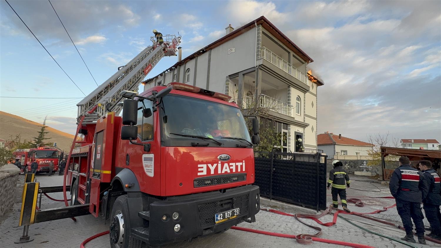 Alınan bilgiye göre, ilçeye bağlı Yaraşlı Mahallesinde Mehmet Y.'ye ait üç katlı bir evin çatı kısmında henüz bilinmeyen bir nedenle yangın çıktı.