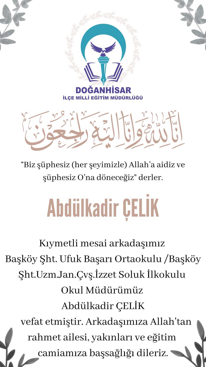 Doğanhisar İlçe Milli Eğitim Müdürlüğü, Başköy Şehit Ufuk Başarı Ortaokulu ile Başköy Şehit Uzm. Jan. Çvş. İzzet Soluk İlkokulu Müdürü Abdülkadir Çelik'in vefatı dolayısıyla taziye mesajı yayımladı.