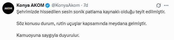 Yapılan açıklamada, "Şehrimizde hissedilen sesin sonik patlama kaynaklı olduğu teyit edilmiştir. Söz konusu durum, rutin uçuşlar kapsamında meydana gelmiştir. Kamuoyuna saygıyla duyurulur.” ifadelerine yer verildi.