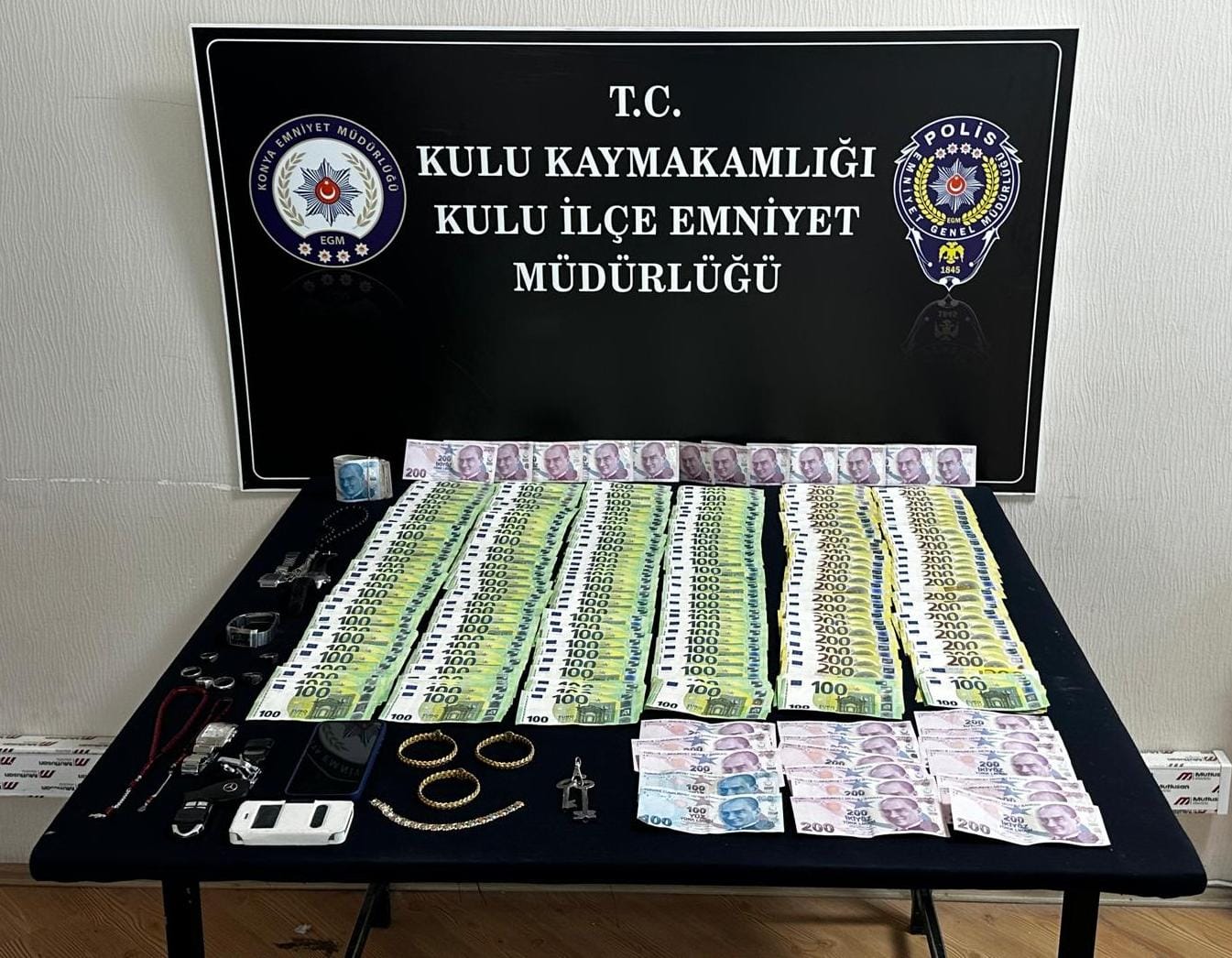 Şüphelinin yanında bulunan çantada yapılan aramada; 3 adet bilezik, 27 bin 550 Euro, 8 bin 235 TL ile Mercedes marka bir araca ait anahtar ele geçirildi. Ele geçirilen eşyaların, 28 Aralık 2025 günü Kulu ilçesi Cumhuriyet Mahallesi'nde meydana gelen oto ve evden hırsızlık olaylarında çalınan eşyalar olduğu tespit edildi.