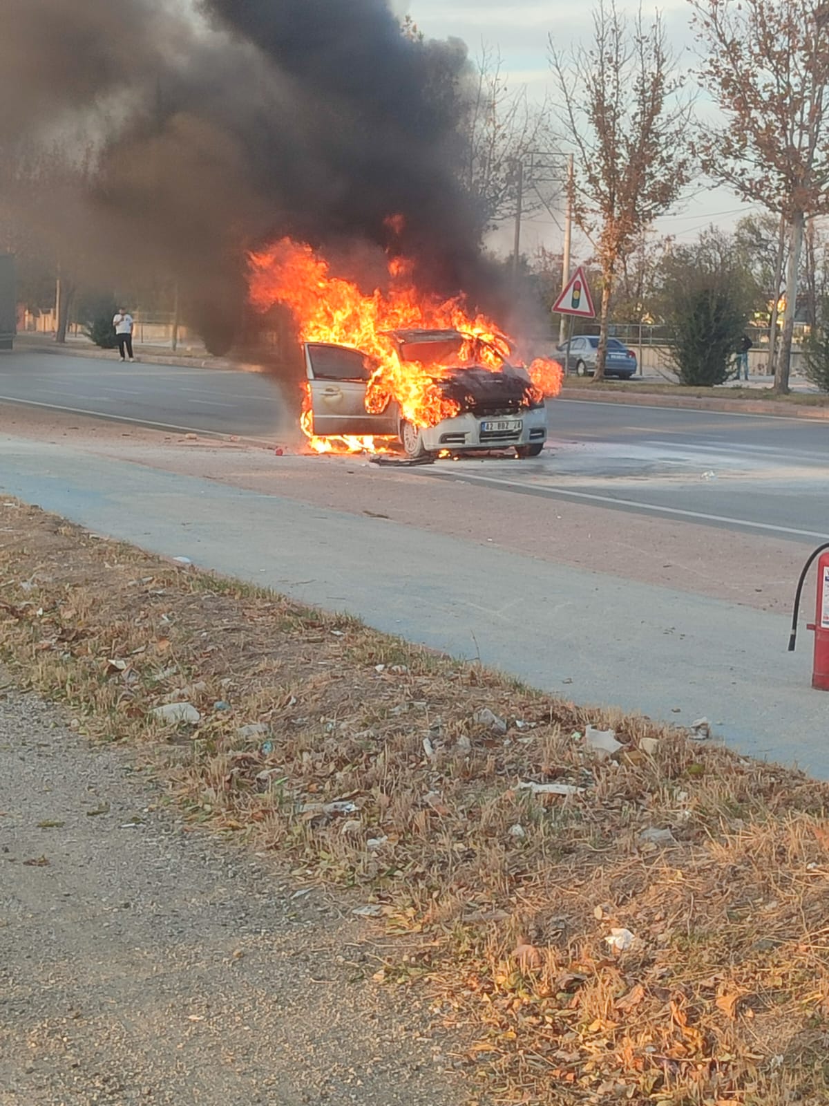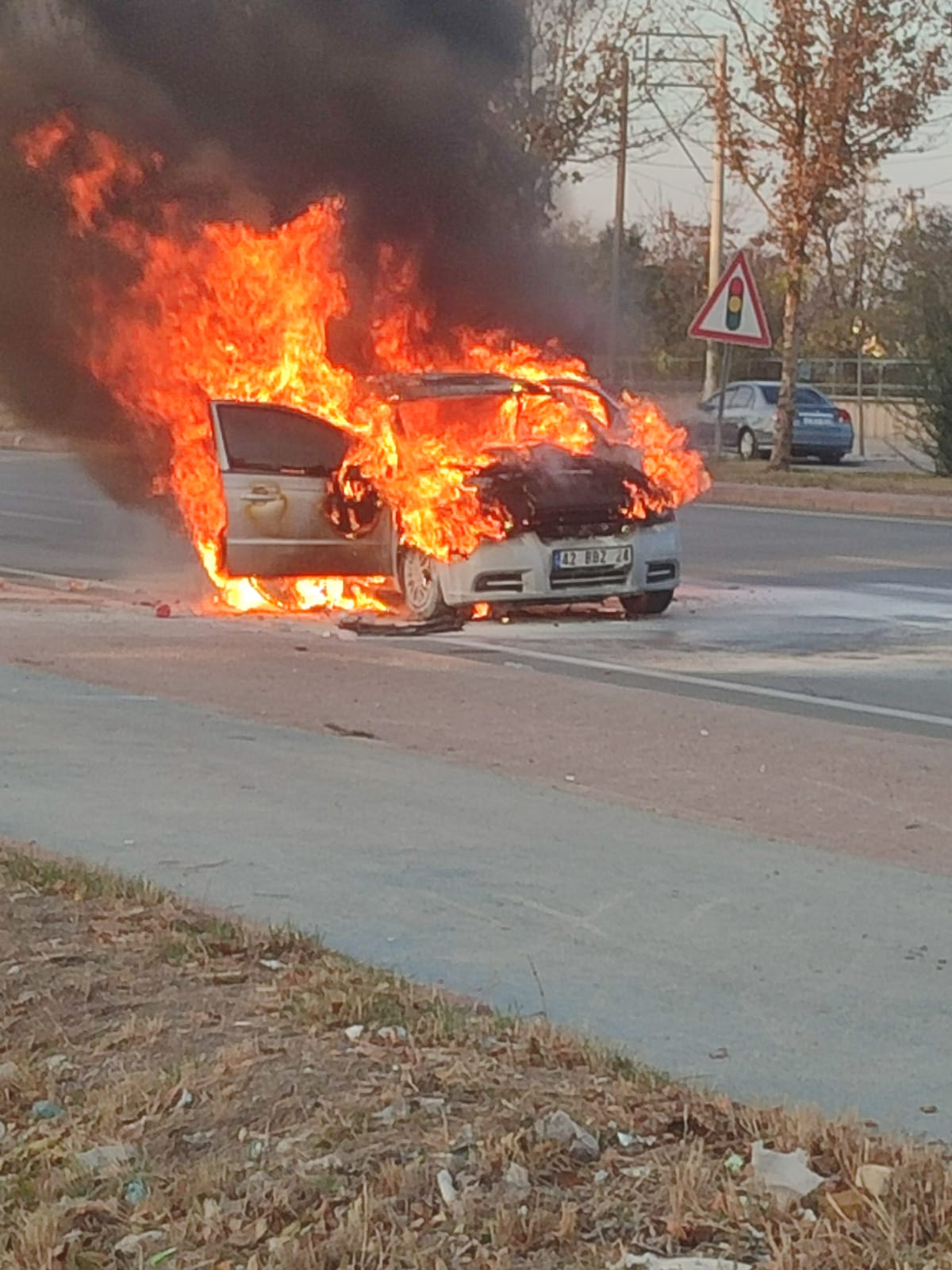Araç seyir halindeyken bir anda motor kısmından dumanlar yükseldi. Panik yaşayan sürücü, aracı yol kenarına çekip inerek canını son anda kurtardı. Kısa sürede büyüyen alevler otomobili sardı.