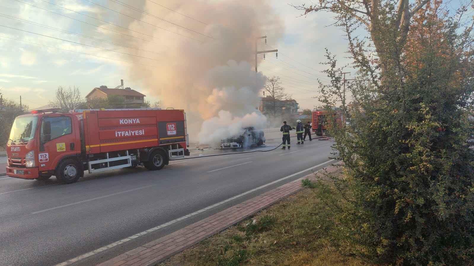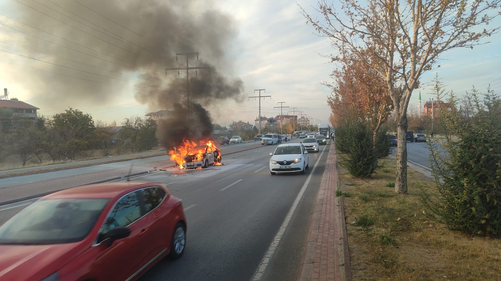 Konya'nın Meram ilçesinde seyir halindeki bir otomobil henüz belirlenemeyen bir nedenle alev aldı. Karaman Caddesi üzerinde meydana gelen olayda, sürücü aracı durdurarak son anda kendini kurtardı.