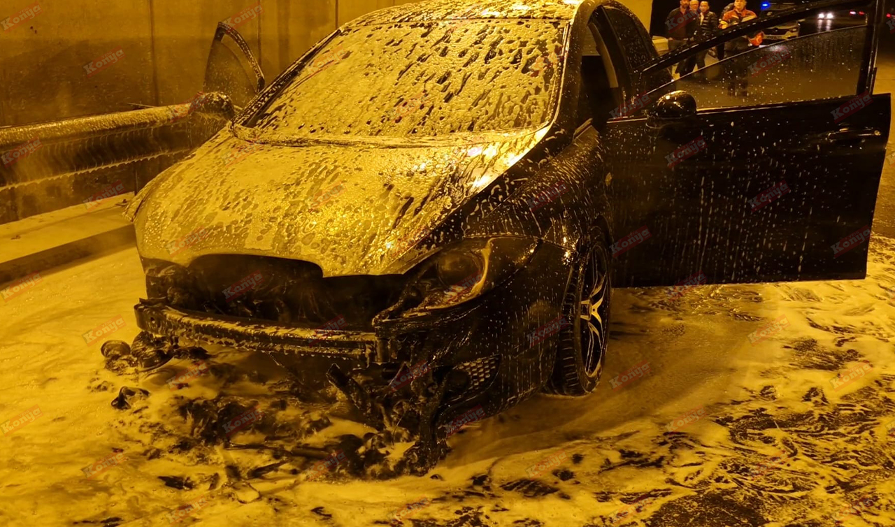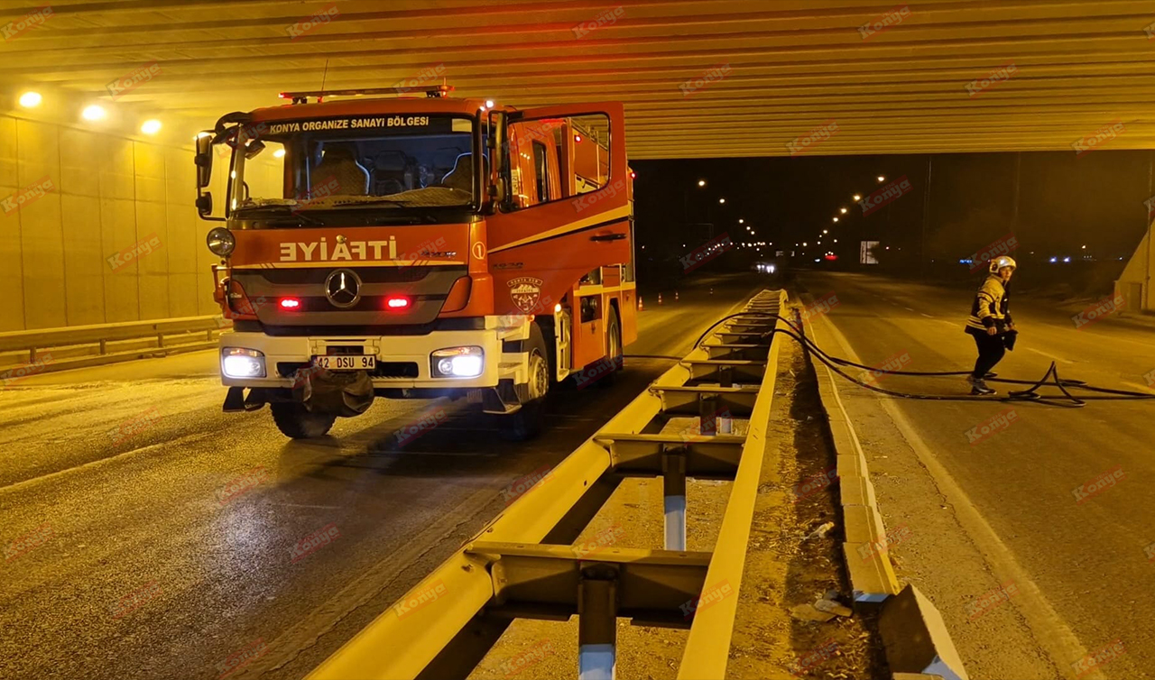 Konya’nın Selçuklu ilçesinde gece saatlerinde hareket halindeki bir otomobilin motor kısmında çıkan yangın paniğe neden oldu.