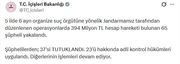 İçişleri Bakanlığı, resmi sosyal medya hesaplarından 5 ilde 6 ayrı organize suç örgütüne yönelik jandarma tarafından düzenlenen operasyonlarda 394 milyon lira hesap hareketi bulunan 65 şüphelinin yakalandığını açıkladı. Aynı zamanda Bakanlık, şüphelilerden 37'sinin tutuklandığını, 23'ü hakkında da adli kontrol hükümleri uygulandığını bildirdi.
