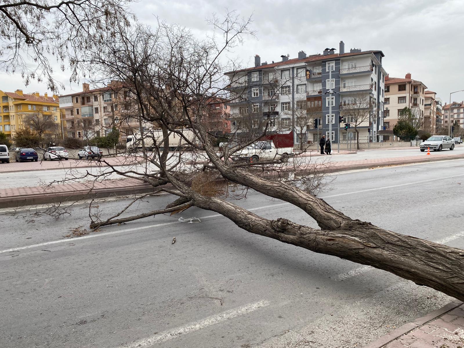 Konya'nın Karatay ilçesinde etkili olan olumsuz hava koşulları, Başak Caddesi üzerinde bir ağacın devrilmesine neden oldu. Devrilen ağaç nedeniyle cadde, geçici olarak trafiğe kapatıldı.