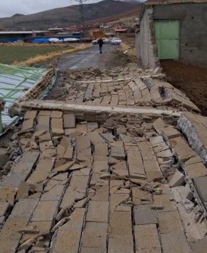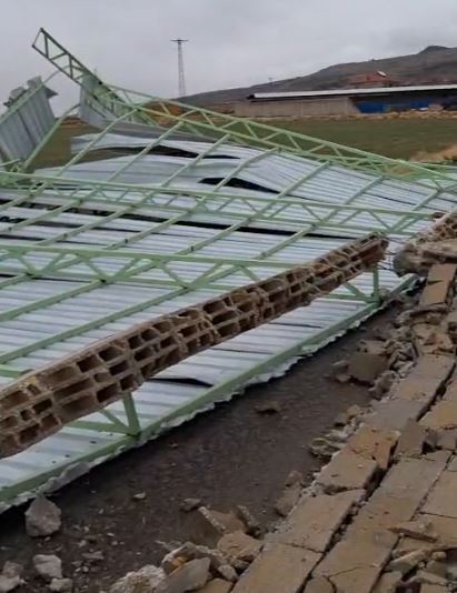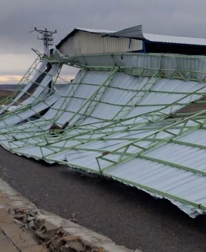 Rüzgarın etkisiyle hayvanların üzerindeki demir korumalar da yerinden söküldü. Yıkılan duvar parçaları ve demir aksam yola savrulurken, çevrede kısa süreli panik yaşandı.