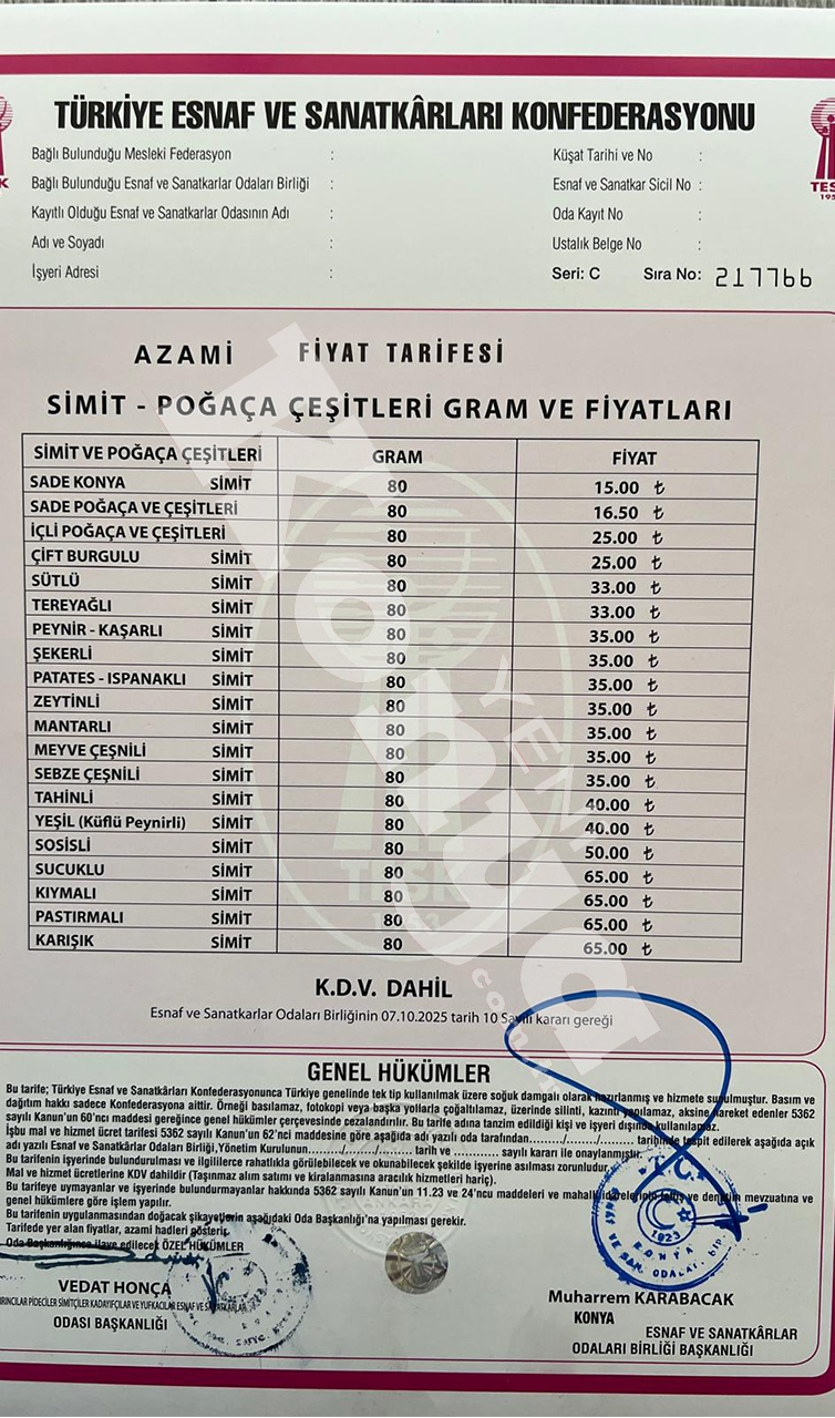 Komisyonun yaptığı toplantı neticesinde, 80 gram pişmiş sade Konya simidinin satış fiyatı 15,00 TL olarak belirlendi.