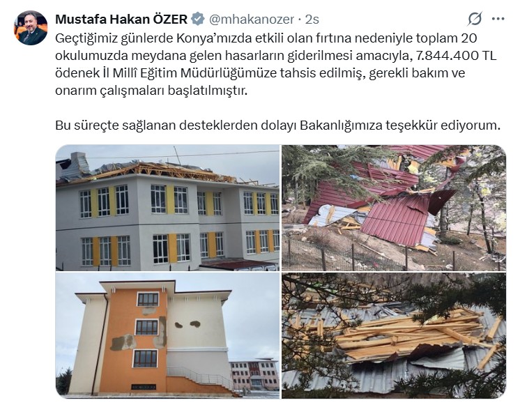 "Geçtiğimiz günlerde Konya'mızda etkili olan fırtına nedeniyle toplam 20 okulumuzda meydana gelen hasarların giderilmesi amacıyla, 7.844.400 TL ödenek İl Millî Eğitim Müdürlüğümüze tahsis edilmiş, gerekli bakım ve onarım çalışmaları başlatılmıştır.