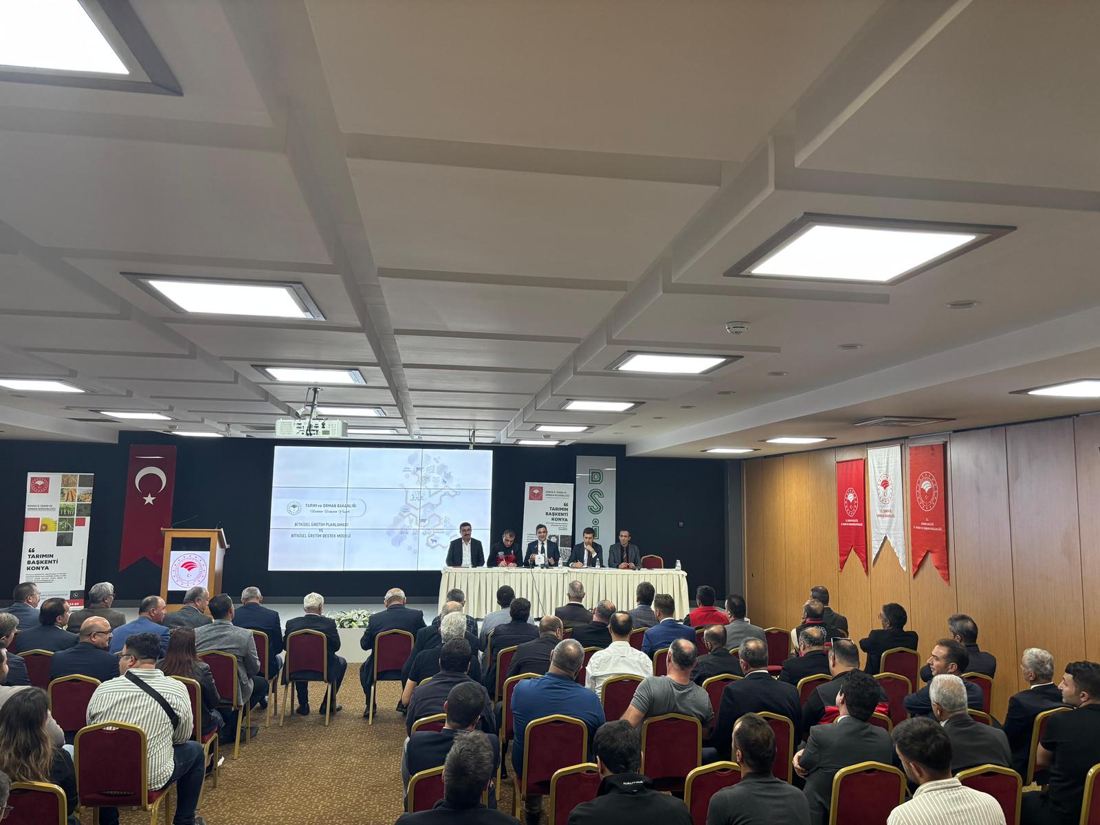 Toplantıya; Konya İl Tarım ve Orman Müdürü Duran Seçen, Ziraat Odası Başkanları, İlçe Tarım Müdürleri ile ÇKS (Çiftçi Kayıt Sistemi) İl ve İlçe Sistem Sorumluları da katıldı.