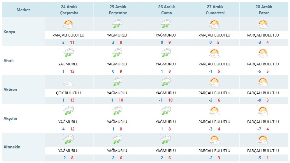 Rapora göre 24 Aralık Çarşamba günü (bugün) Konya'nın birçok ilçesinde yağış bekleniyor. Yağışlı havanın 25 Aralık Perşembe ve 26 Aralık Cuma günleri boyunca da etkisini sürdürmesi öngörülüyor.