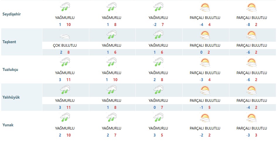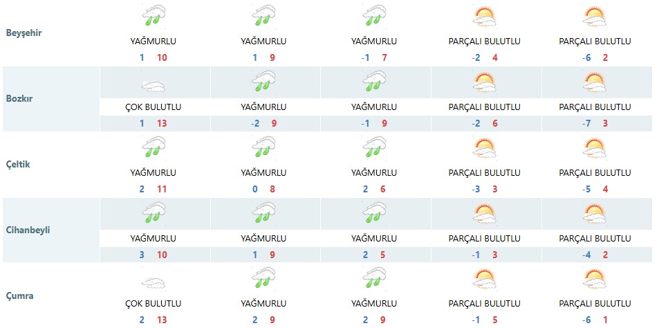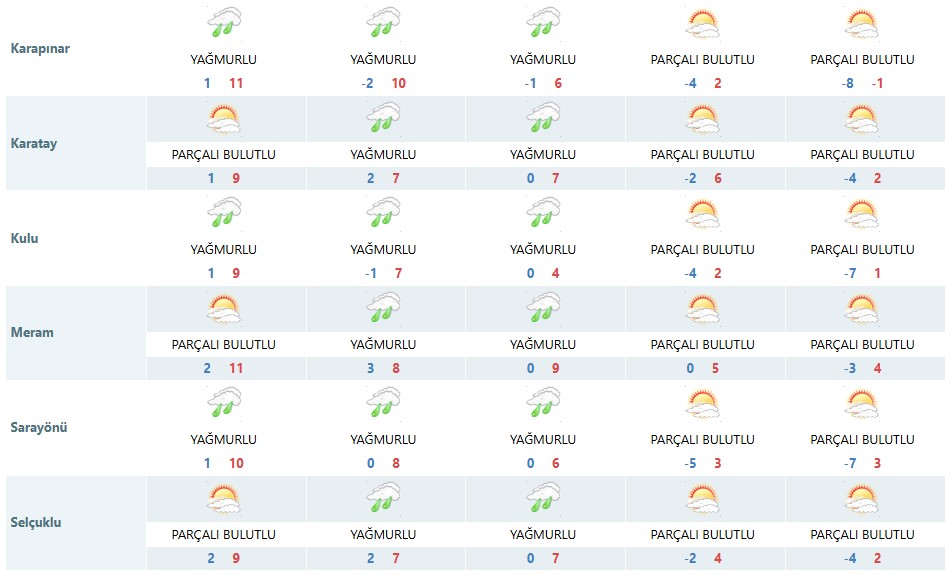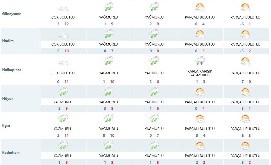 Meteoroloji Genel Müdürlüğü, Konya'nın merkez ilçesi dahil olmak üzere 31 ilçesini kapsayan beş günlük hava tahmin raporunu yayımladı. Açıklanan verilere göre kent genelinde hafta boyunca yağışlı ve soğuk hava etkili olacak.
