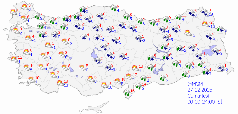 Haftanın son günü olan 28 Aralık Pazar günü ise soğuk hava etkisini artıracak. Birçok ilçede gece hava sıcaklıklarının -10 dereceye kadar düşmesi beklenirken, yetkililer don ve buzlanmaya karşı vatandaşları dikkatli olmaları konusunda uyardı.