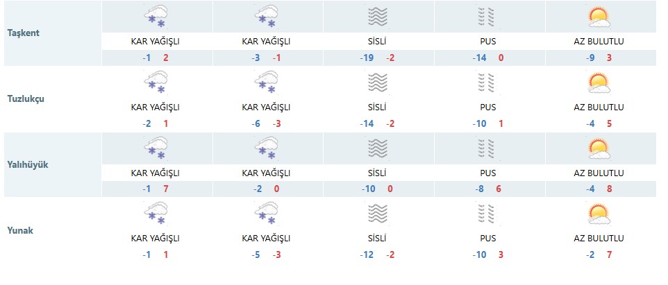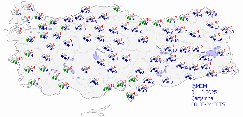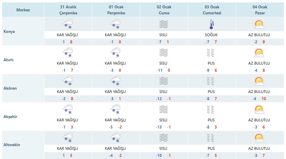 Rapora göre 2025 yılının son gününde Konya genelinde lapa lapa kar yağışı bekleniyor. Kent merkeziyle birlikte Derebucak, Seydişehir, Yalıhüyük, Ahırlı,