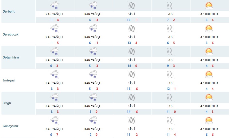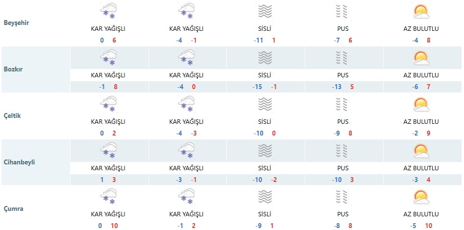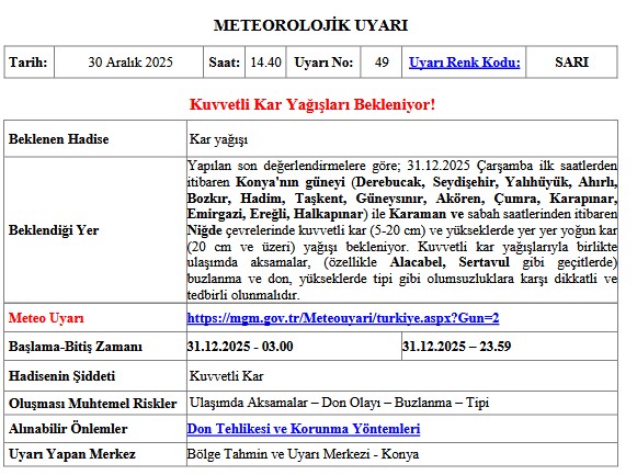Bozkır, Hadim, Taşkent, Güneysınır, Akören, Çumra, Karapınar, Emirgazi, Ereğli ve Halkapınar ilçelerinde etkili olması öngörülen kar yağışı, yeni yıl öncesi kış şartlarını iyiden iyiye hissettirecek.