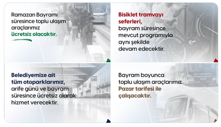 Bayram boyunca toplu ulaşım araçlarının çalışma saatleri Pazar tarifesine göre uygulanacak. Bu kapsamda otobüs ve tramvay seferleri hafta sonu düzenine uygun şekilde hizmet verecek.