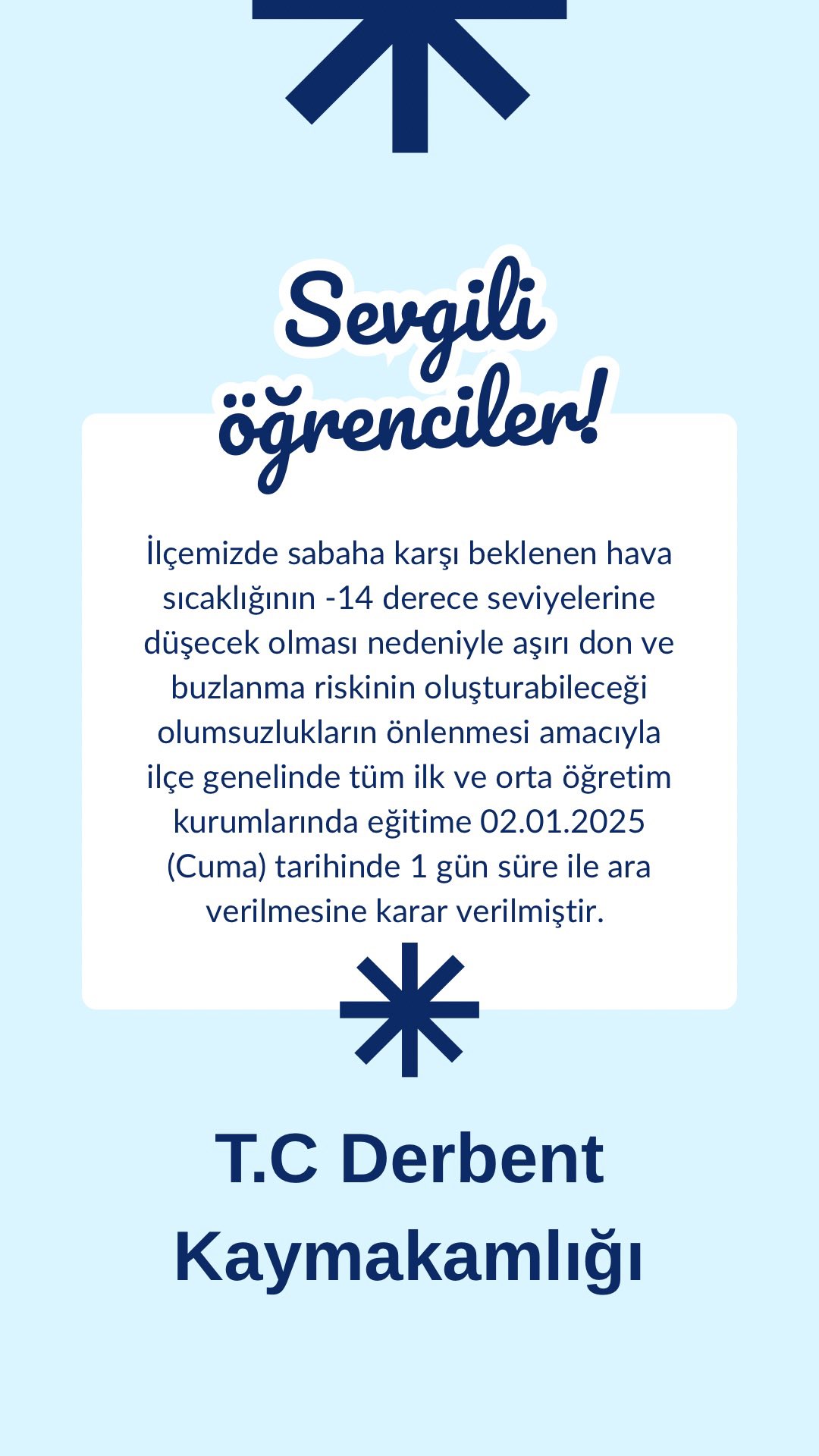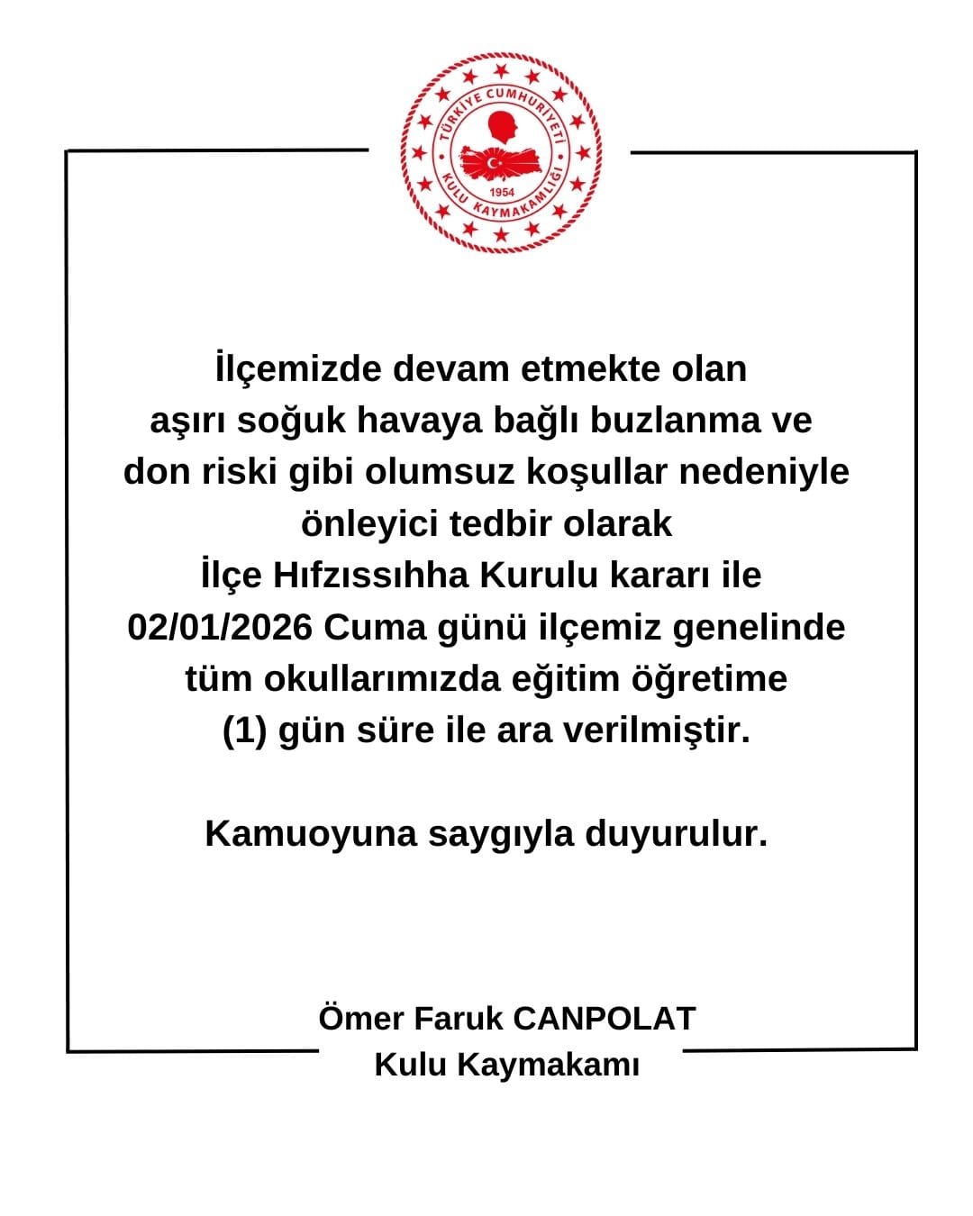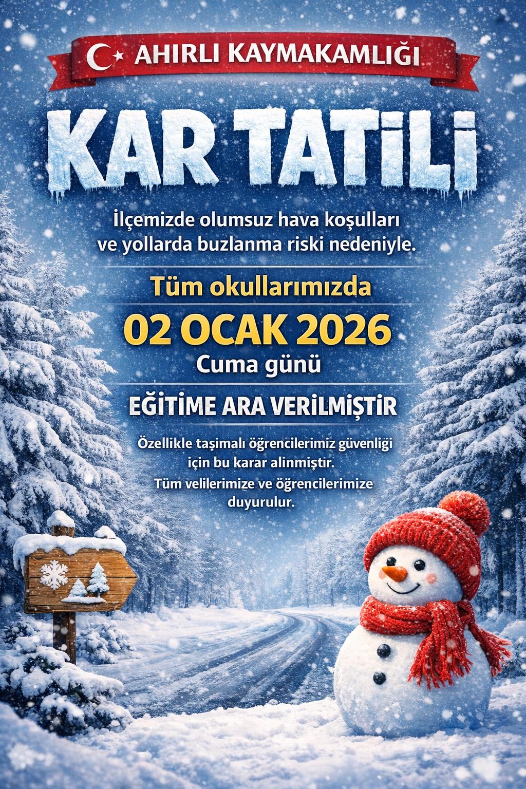 2 Ocak 2026 Cuma günü eğitim ve öğretime 1 gün süreyle ara verildi.