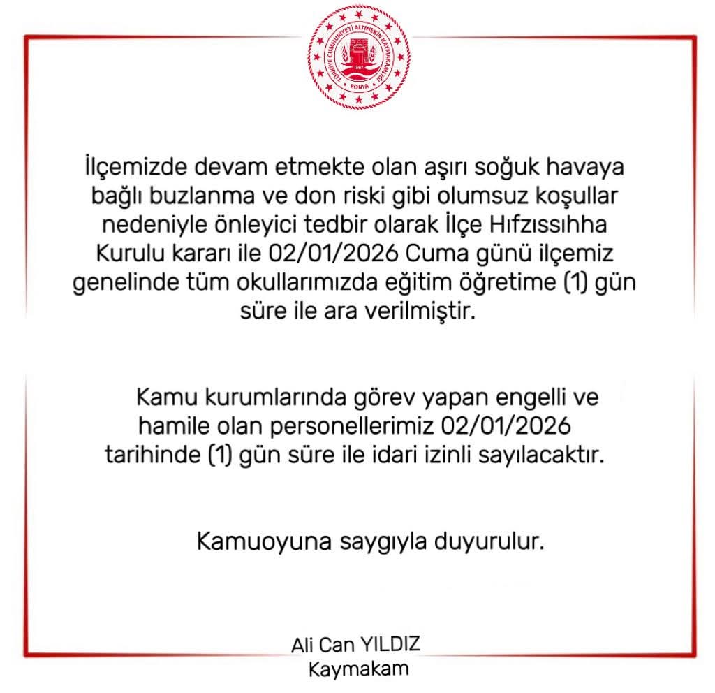 Konya'nın Akşehir ilçesinde ise 2 Ocak 2026 tarihinde (yarın) olumsuz hava koşulları (don ve buzlanma) nedeniyle Taşımalı Eğitime 1 gün süreyle ara verildiği duyuruldu.
