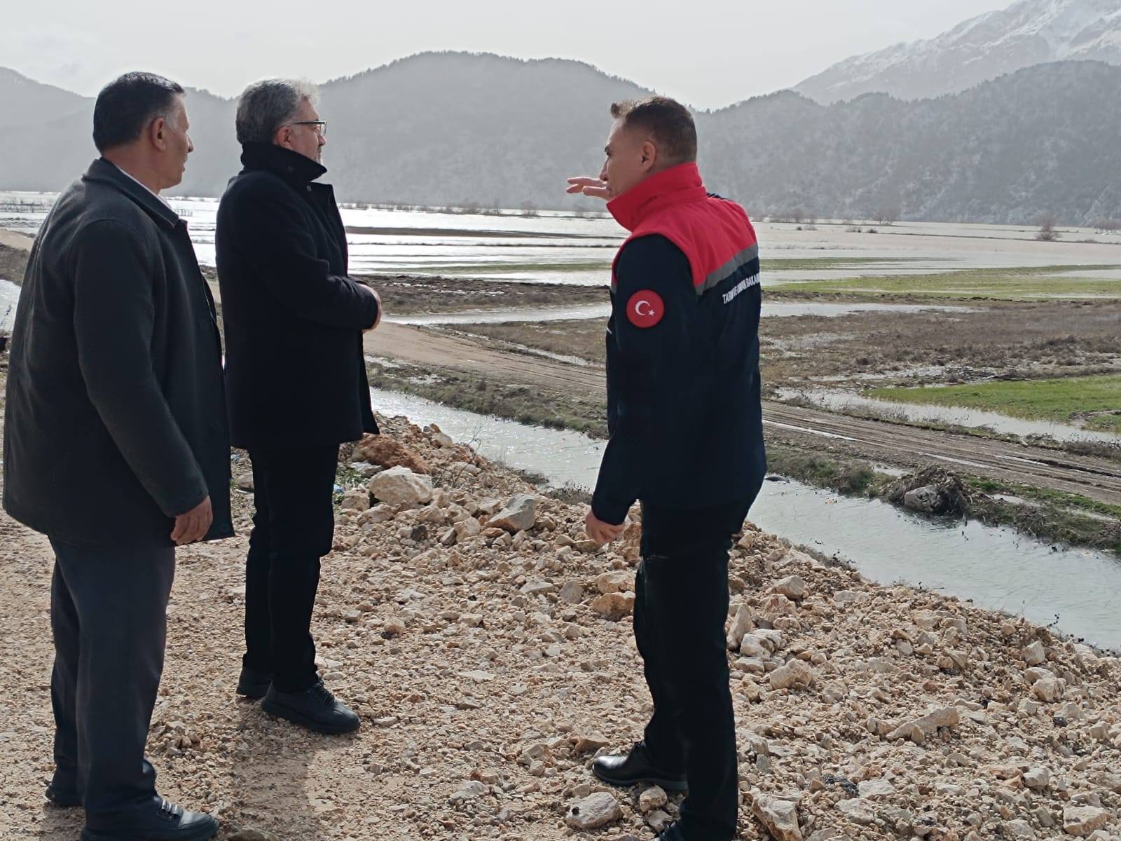 İl Tarım ve Orman Müdürü Duran Seçen; Derebucak İlçe Tarım ve Orman Müdürü Aybars Yiğit, Pınarbaşı Mahallesi Muhtarı Şevket Taşkara ve Pınarbaşı Tarımsal Kalkınma Kooperatifi Başkanı Nuhan Bozkurt ile birlikte sular altında kalan tarlalarda incelemelerde bulundu.