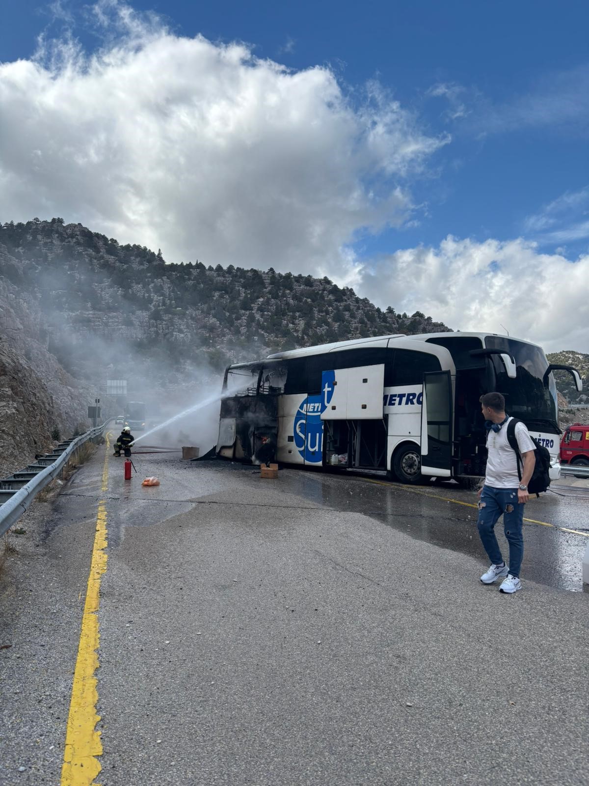 Yangının fark edilmesi üzerine araç kontrollü olarak durdurularak yolcular tahliye edildi. İhbar üzerine olay yerine sevk edilen itfaiye ekiplerince yangın kontrol altına alınarak söndürüldü.