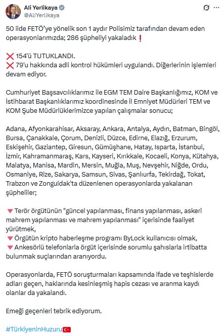 İçişleri Bakanı Ali Yerlikaya, 50 ilde FETÖ’ye yönelik operasyonlarda 286 şüphelinin yakalandığını, 154’ünün tutuklandığını açıkladı.