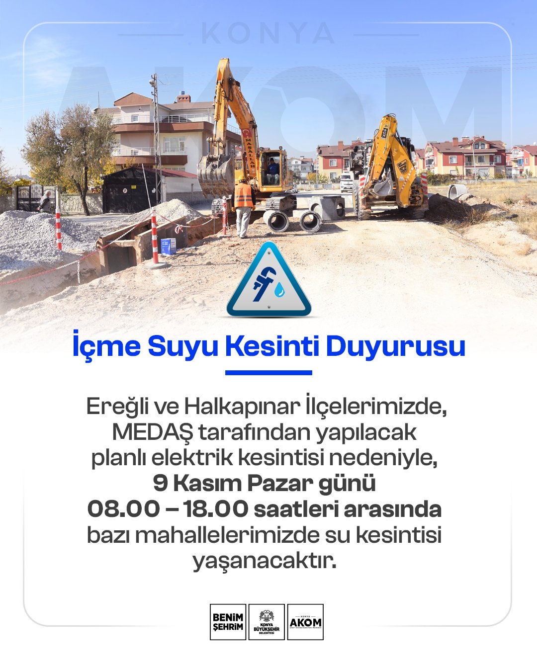 Konya'nın Ereğli ve Halkapınar ilçelerinde, MEDAŞ tarafından yapılacak planlı elektrik kesintisi nedeniyle su kesintisi yaşanacak. AKOM'un sosyal medya hesabından yapılan açıklamada, vatandaşların gerekli tedbirleri önceden alması gerektiği bildirildi.