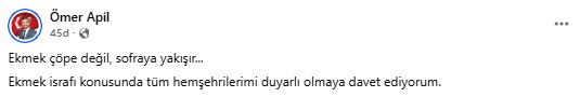 Başkan Apil, ekmeğin sadece bir gıda ürünü olmadığını, aynı zamanda kültürel ve insani açıdan büyük bir anlam taşıdığını ifade etti. Ekmek israfının toplumsal bir sorun olduğuna dikkat çeken Apil, "Ekmek çöpe değil, sofraya yakışır. Bu konuda tüm hemşehrilerimi daha bilinçli ve duyarlı olmaya çağırıyorum” dedi.