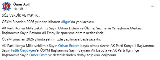 "Söz verdik ve yaptık. ÖSYM sınavları 2026 yılından itibaren Ilgın'da yapılacaktır. Bu önemli kazanım ilçemiz için hayırlı olsun.”