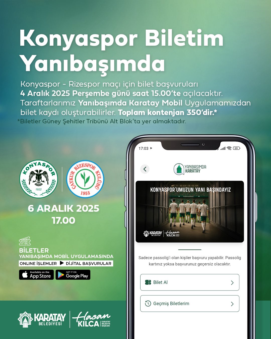 Karatay Belediyesi, sosyal medya hesabından yaptığı açıklamayla Konyaspor'un 6 Aralık Cumartesi günü oynayacağı Rizespor karşılaşması için hediye bilet başvurularının başlayacağını duyurdu. Belediyeden yapılan paylaşımda, başvuruların 4 Aralık 2025 Perşembe günü saat 15.00'te açılacağı belirtildi.