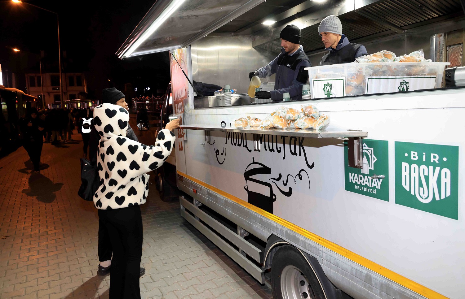 Karatay'da soğuk havalarda ilçenin farklı noktalarında hizmet veren mobil ikram araçlarıyla, sabahın erken saatlerinde işe, okula ya da hastaneye gitmek üzere yola çıkan vatandaşlara sıcak çorba ikram ediliyor. İlçenin işlek noktalarında gerçekleştirilen uygulama ile vatandaşlar güne güzel bir başlangıç yapıyor.