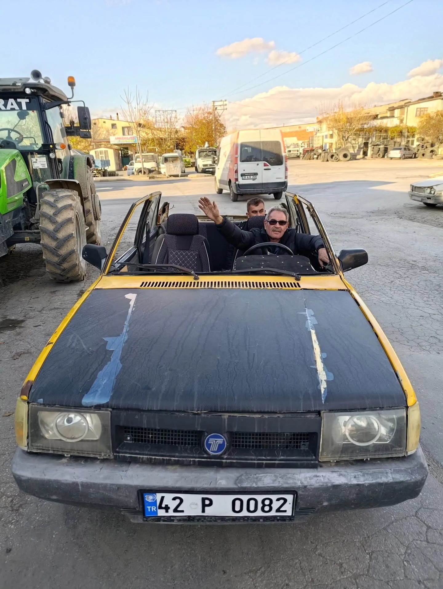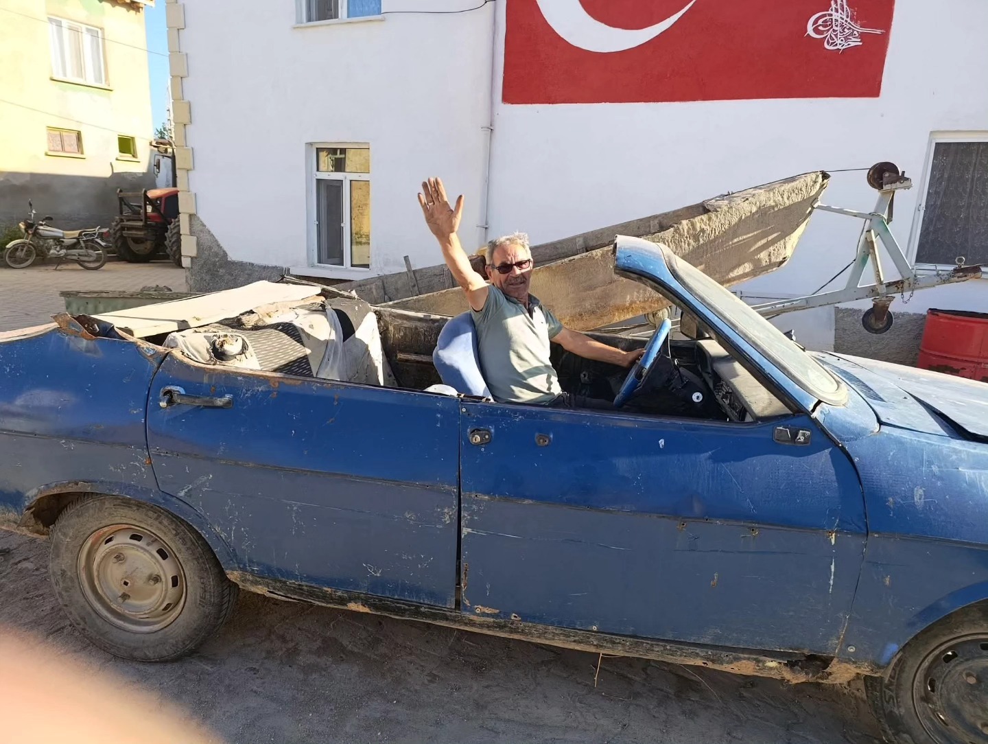 Fotoğrafta da görüldüğü gibi, mavi renkli eski model bir aracın tavanının tamamen kesildiği, iç bölümünün ise neredeyse tamamen söküldüğü görülüyor. Direksiyonda oturan ve vatandaşlara el sallayarak ilerleyen sürücü, ilçe sakinlerinin meraklı bakışlarına neden oldu.